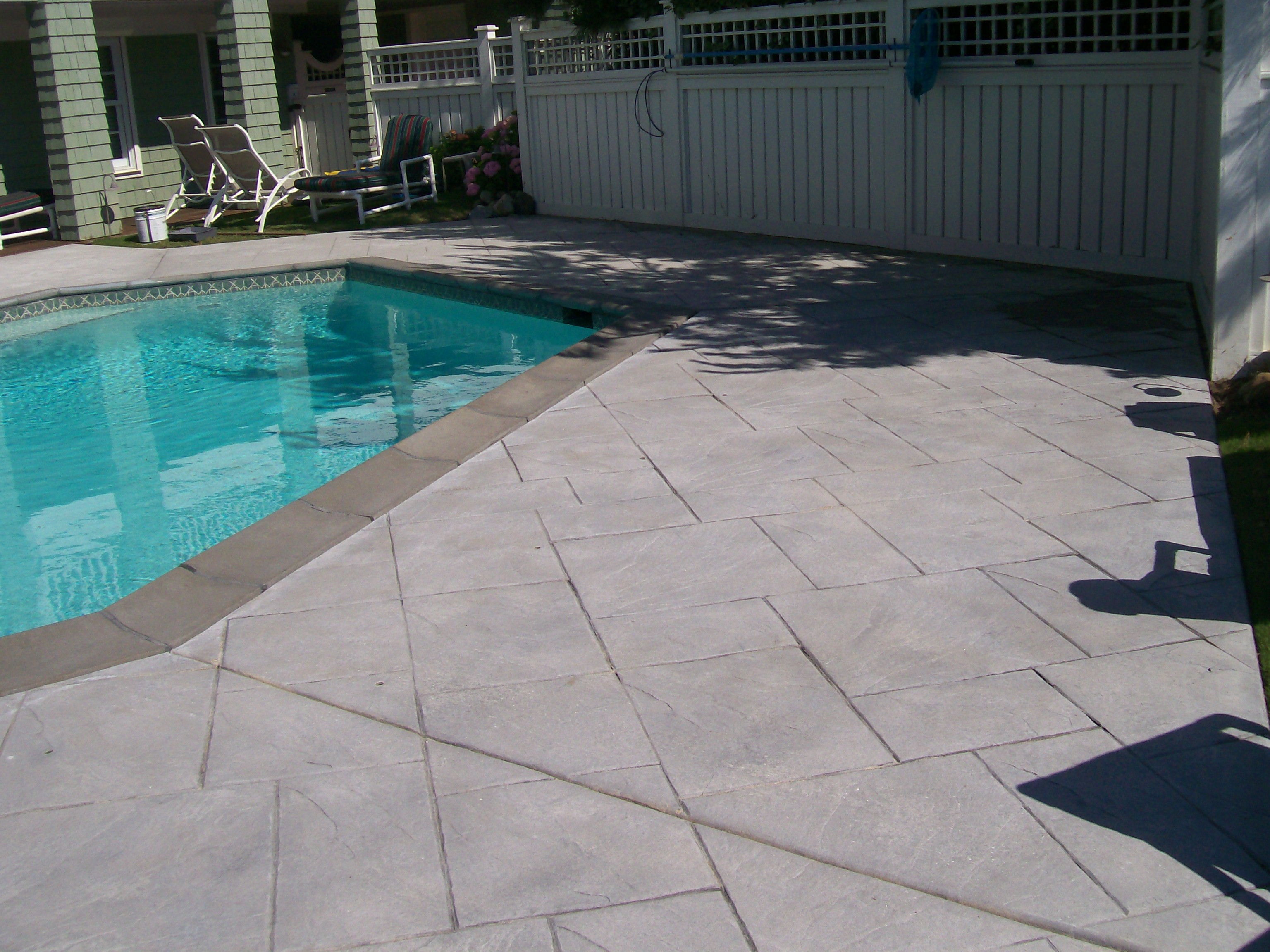 SLATE STAMP, COLOR POOL DECK REPAIR AROUND CONCRETE POOL ON OCEANFRONT PROPERTY IN DUCK