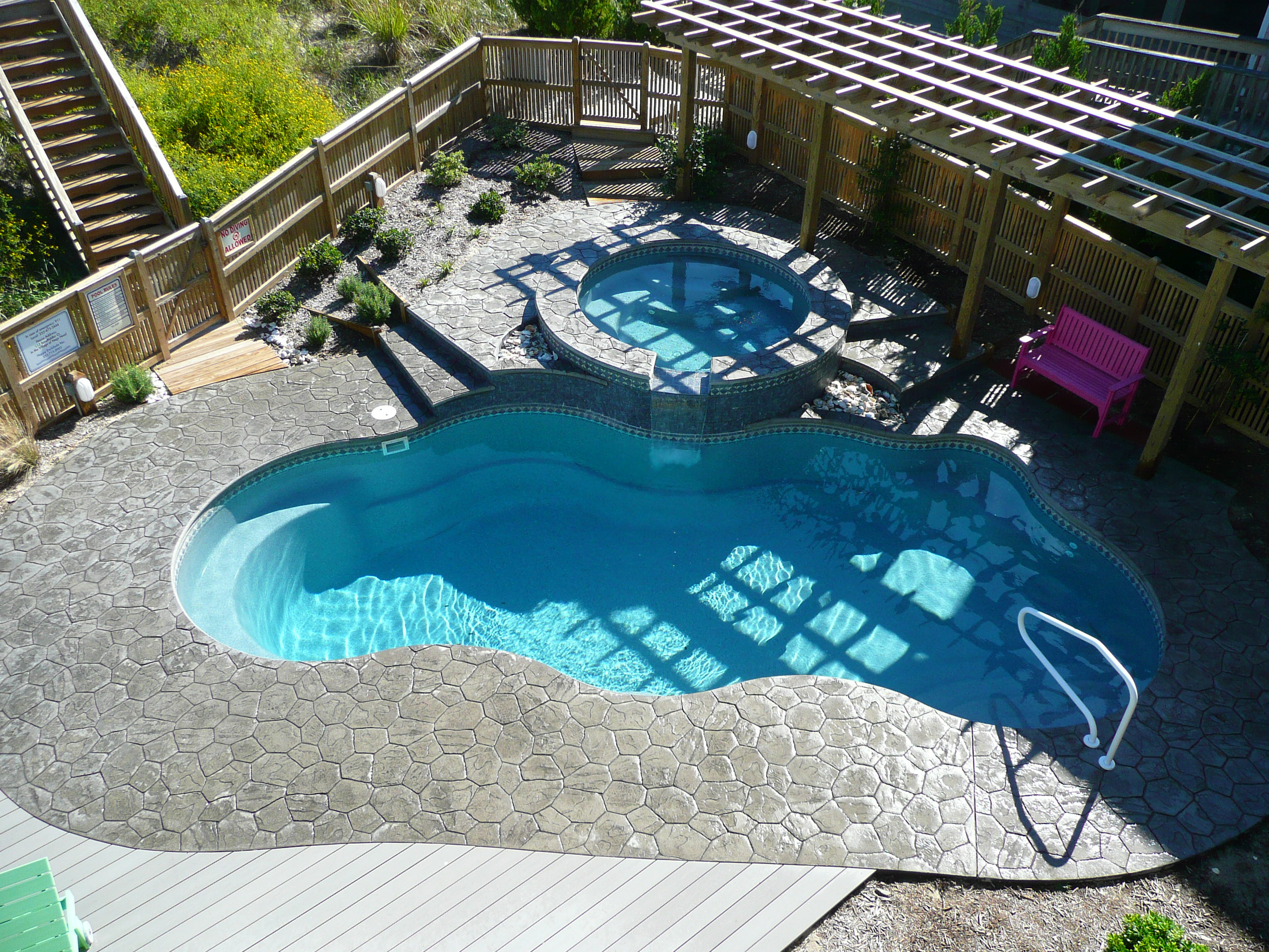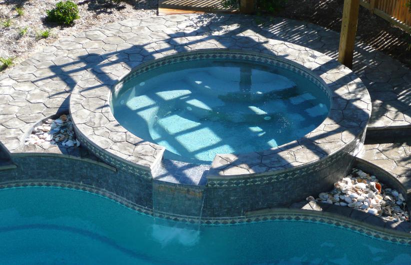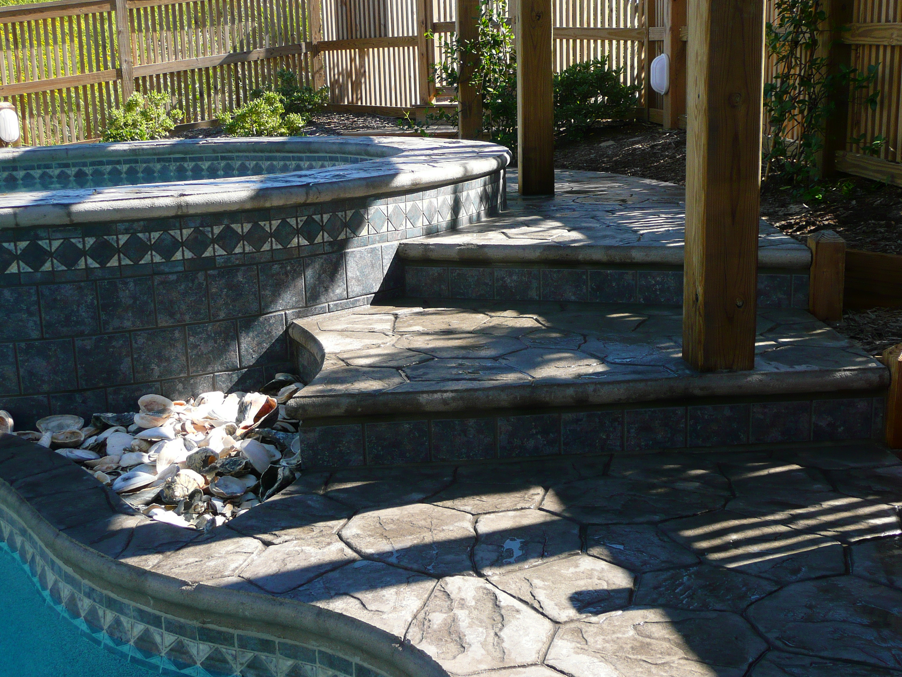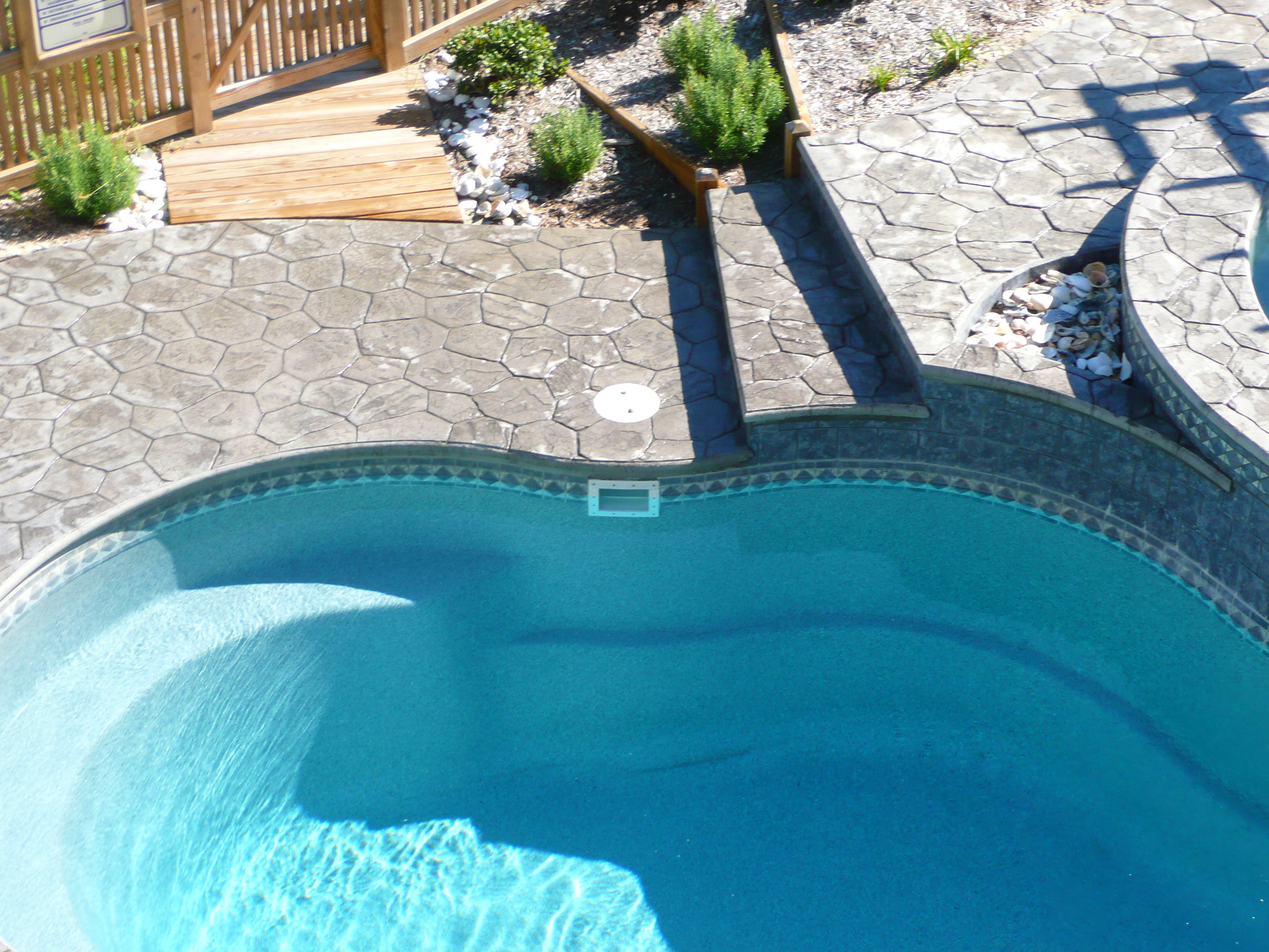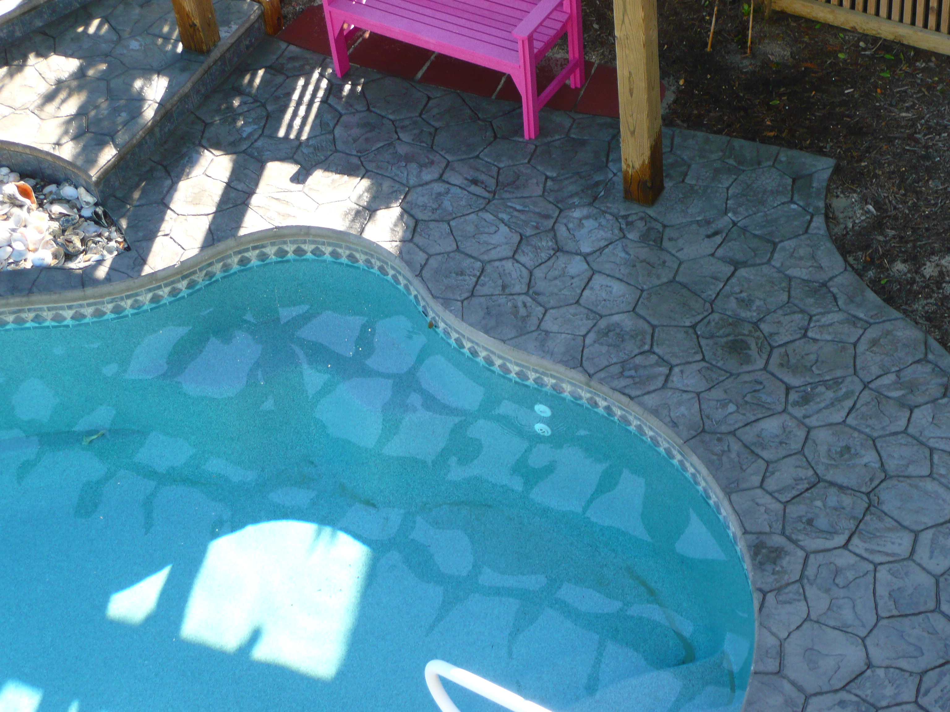 DECORATIVE CONCRETE, RANDOM STONE STAMPING AROUND FIBERGLASS POOL.