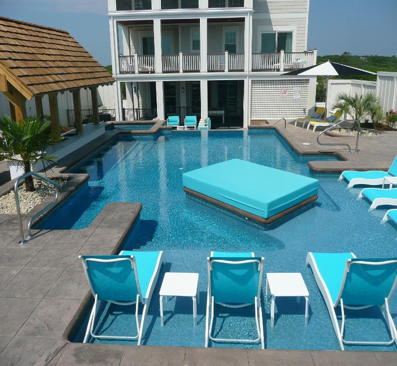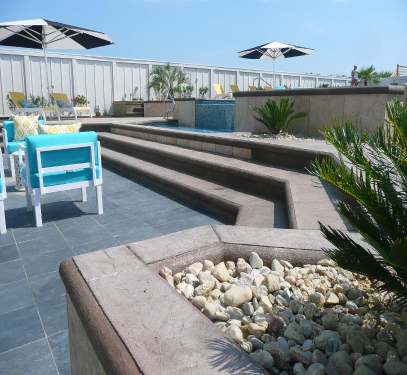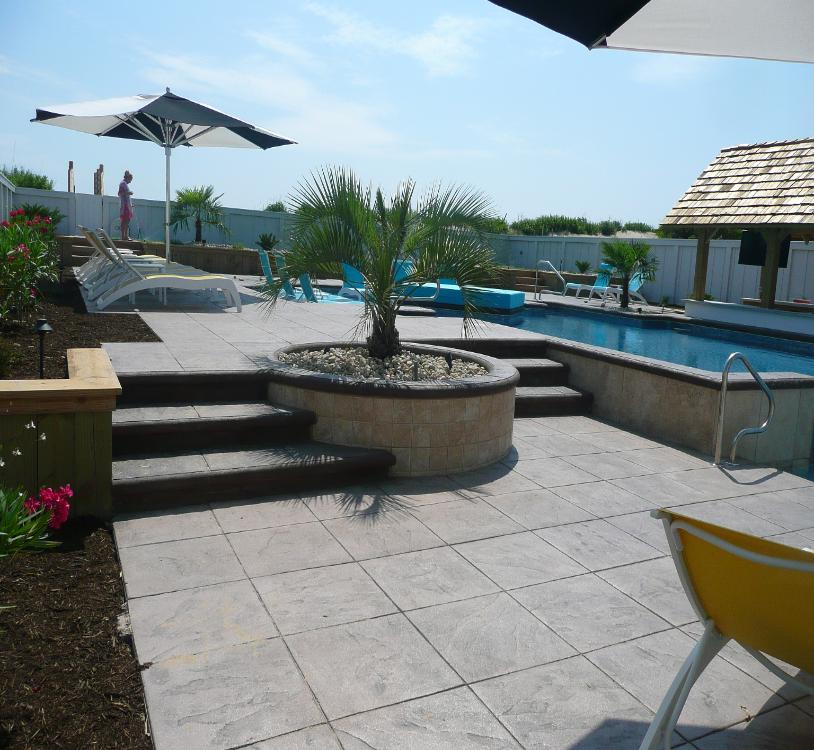 | CANTILEVER EDGE DECK AROUND CONCRETE POOL, PLANTERS, STEPS AND ISLAND WITH CONCRETE WALLS FOR RAISED HOT TUB, STEPS, PLANTERS & THREE LEVEL DECK WITH COMPLETE COLOR, LARGE TILE STAMP PATTERN ON ENTIRE DECK IN PINE ISLAND, COROLLA |